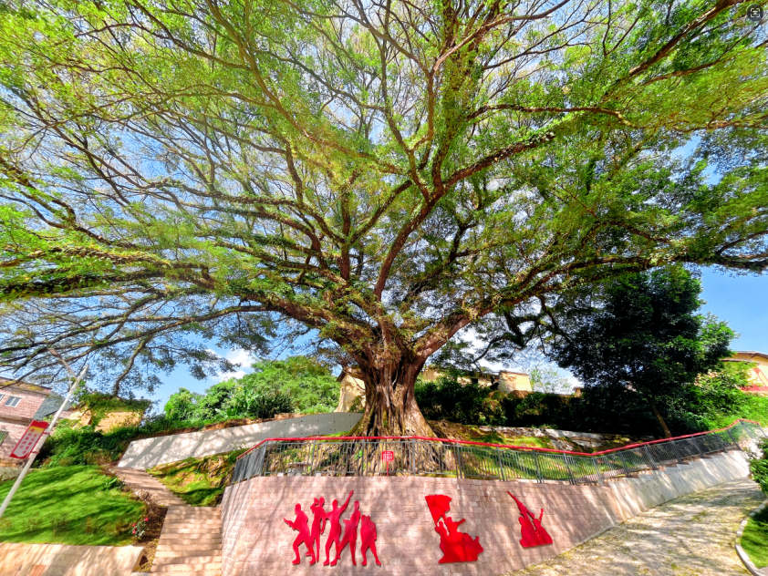 在古树资源保护方面,为大崀村百年榕树等古树名木进行挂牌建档,建立健全常态化养护机制。针对古树周边环境杂乱问题,通过绿化美化、完善基础设施,因地制宜建成百年榕树观景台,让古树成为村庄的“网红打卡点”,既保护了生态资源,又增添了乡村韵味。